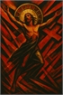 A powerful sacred artwork transformed into a puzzle. Bold reds and deep blacks frame a dramatic central figure, blending spiritual symbolism with modern expressionist geometry. Designed for a thoughtful, immersive assembly experience; final image suitable for display.
